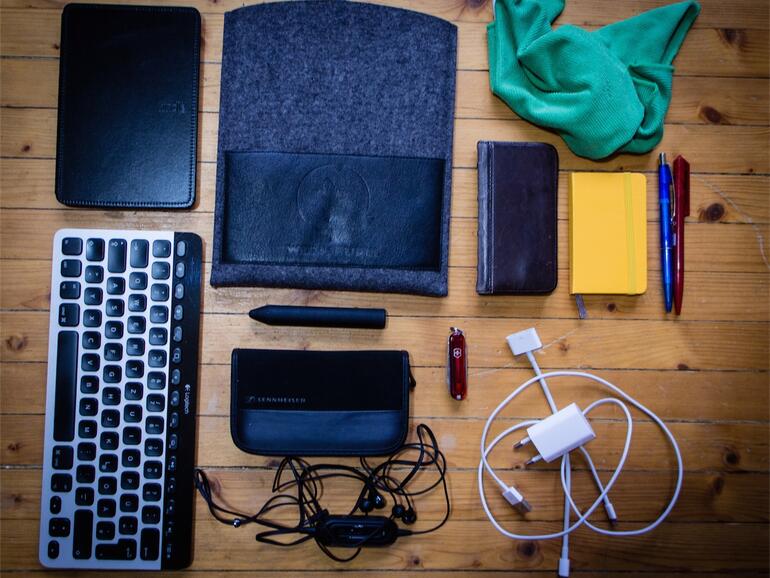 Die prall gefüllten Taschen vieler US-amerikanischer Techblogger können es mitunter mit dem kompletten Sortiment eines Elektronikmarkts aufnehmen: Notebooks, Tablets, Smartphones, Kameras – die bodenlosen Taschen vieler Kollegen beherbergen erstaunliche Mengen aktueller Technik. Mein Bündel fällt deutlich bescheidener aus und steckt dennoch voller Nützlichkeiten: Los geht’s!