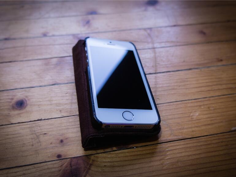 Das in Leder gehüllte Büchlein sieht nur auf den ersten Blick wie eine Bibel für die Hosentasche aus, ist tatsächlich aber ein in eine BookBook-Hülle von Twelve South gehülltes iPhone 5s. Das Apple-Smartphone dient dabei nicht nur der Kommunikation, sondern vor allem den vielen kleinen Spielen aus dem App Store.