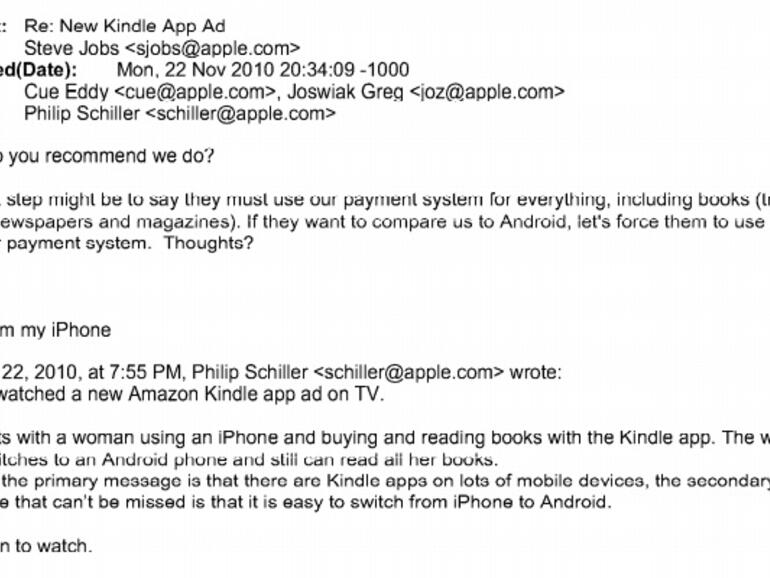 Das US-Justizministerium wertet Apples Regelwerk-Änderungen zu In-App-Käufen als Vergeltungsschlag gegen Amazon. In einem jetzt überarbeiteten Schlichtungsvorschlag heißt es dazu: Das US-Justizministerium sieht Apples damaligen Vorstoß als gezielte Massnahme gegen den Konkurrenten Amazon. Als Beweis wird unter anderem der E-Mail-Verkehr zwischen Steve Jobs, Eddie Cue und Phil Schiller herangezogen: