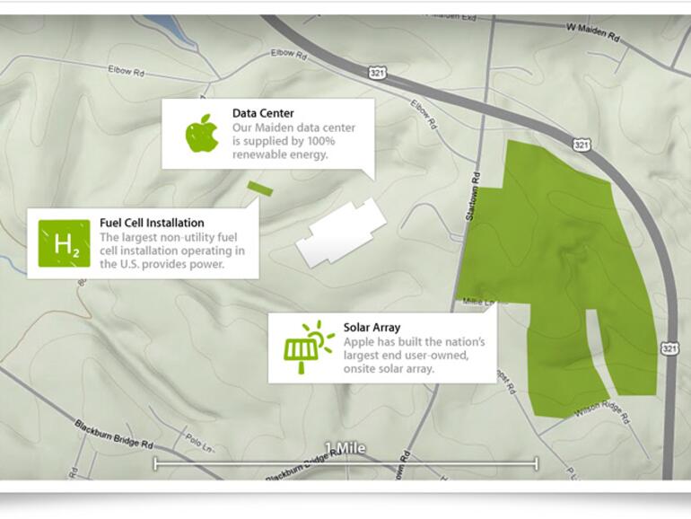 Wie Bloomberg berichtet habe Apple den Umstieg auf Solarstrom, Windkraft, Erdwärme und Biogas für die Datenfarm in Maiden im US-amerikanischen Bundesstaat North Carolina vollzogen. Fossile Brennstofe kommen laut Apple für die iTunes-, iCloud-, und iMessage-Server inzwischen nicht mehr zum Einsatz. Das derzeit noch im Bau befindliche Datenzentrum in Prinveville im US-Bundesstaat Oregon wird bei Fertigstellung ebenfalls aus erneuerbaren Energien gespeist.