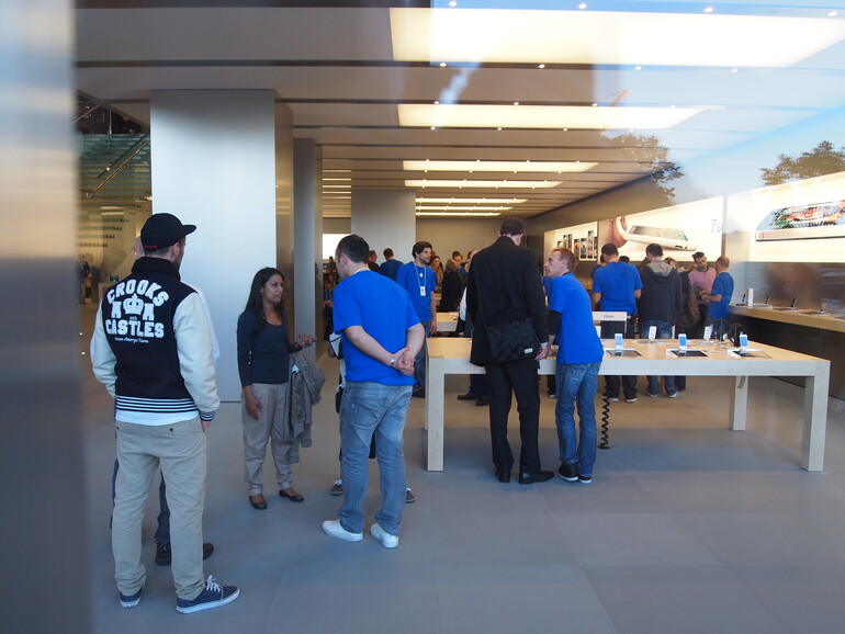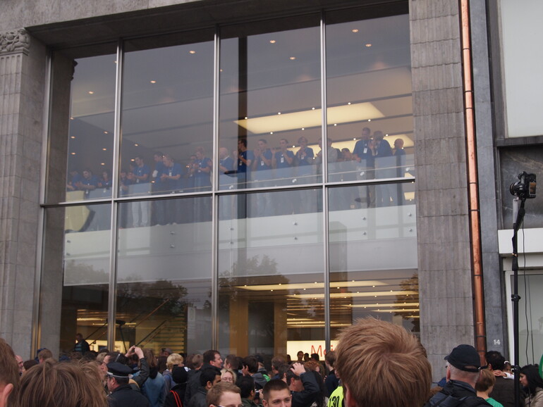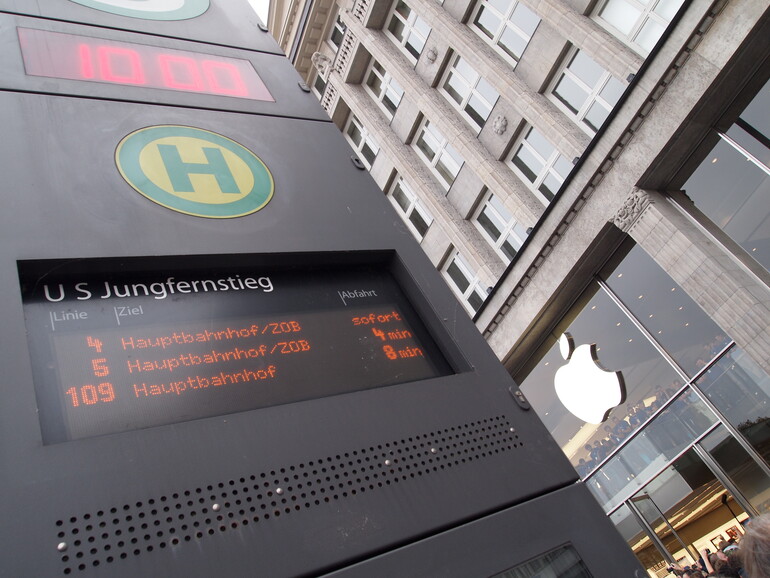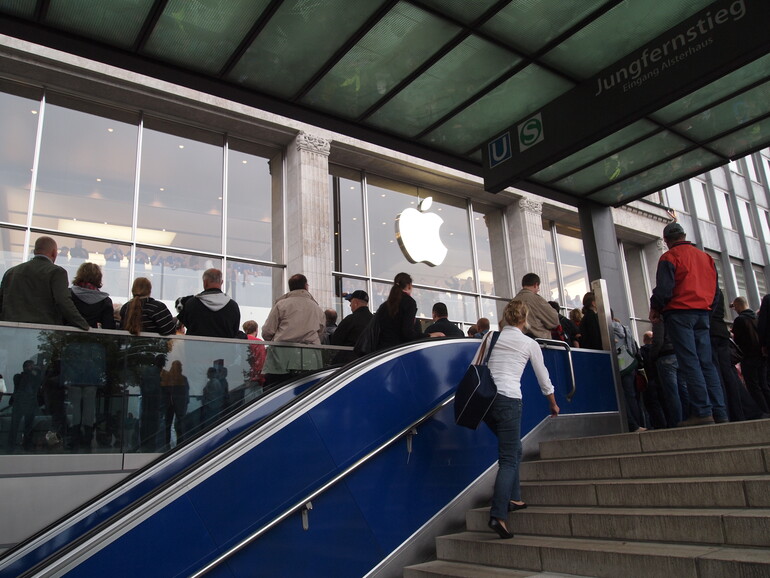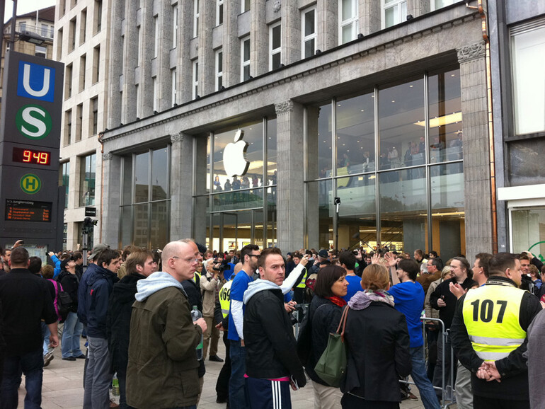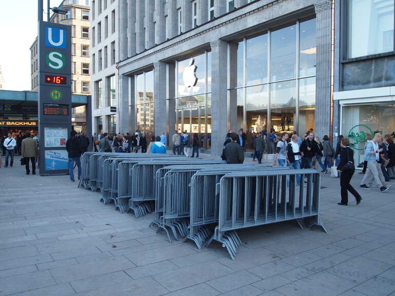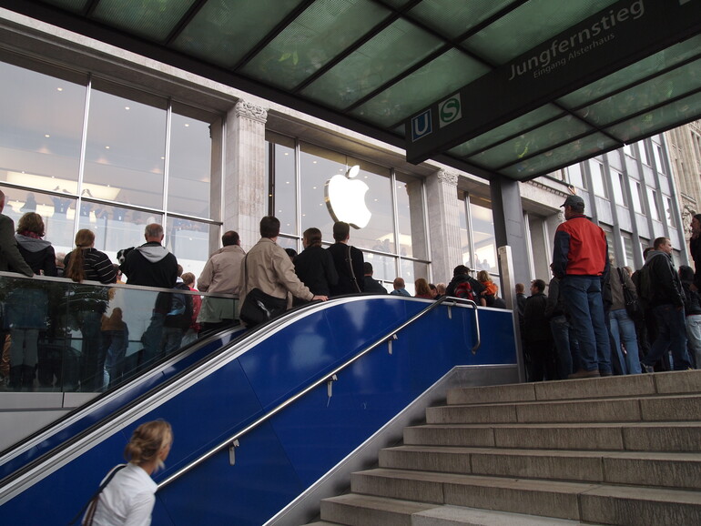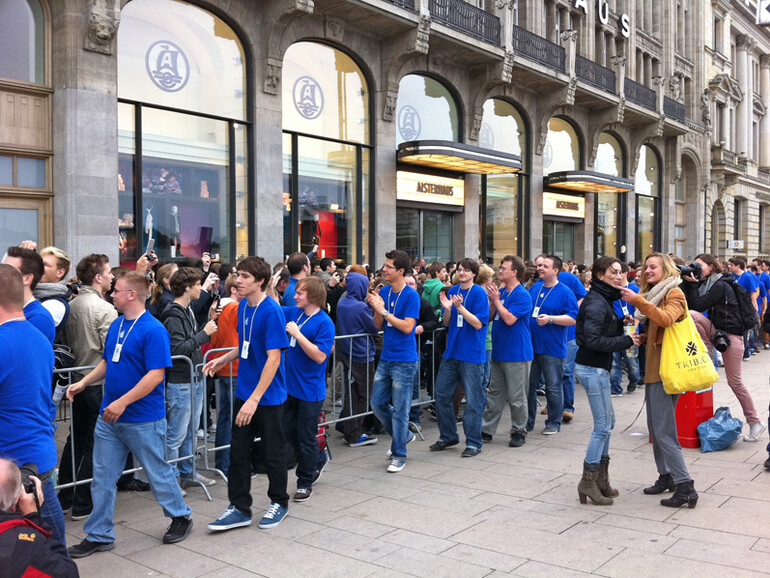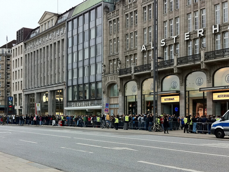 Der Ansturm war gewaltig, die Stimmung hervorragend. Bereits in den frühen Morgenstunden warteten eingefleischte Apple-Fans auf den Einlass. Wie immer nichts außergewöhnliches bei der Eröffnung eines neues Stores. 3.000 kostenlose T-Shirts erwarteten die ersten Besucher, doch bei einer rund 200 Meter langen Schlange, die nochmals in Sektoren aufgeteilt war und sich entlang des Jungfernstiegs erstreckte, wurde das Ergattern einer solchen Trophäe zum Glücksspiel.