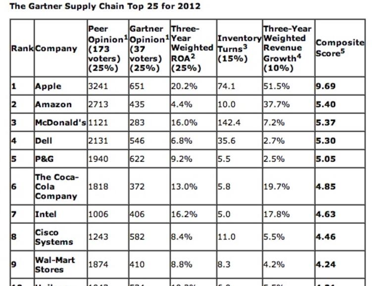 Das Marktforschungs-Unternehmen Gartner schaut jährlich auf die besten Lieferketten der großen Fortune 500-Unternehmen. Gegeneinander aufgestellt werden dabei Faktoren wie die Lagerumschlagshäufigkeit und die Gesamtkapitalrentabilität (ROA).