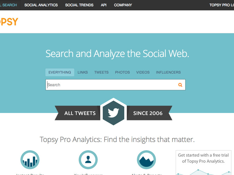 Mit den Analyse-Werkzeugen von Topsy lassen sich Trends auf dem sozialen Netzwerk analysieren und die für bestimmte Themen einflussreichste Person finden. Topsy hat dafür wie einige andere Twitter-Partner Zugriff auf alle Twitter-Daten und verkauft seine Dienste an andere Kunden, die so zum Beispiel feststellen können, wie die Reaktionen auf eine Werbekampagne ausfallen.