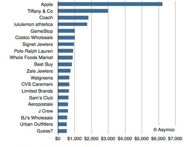 In einer Auflistung vom Marktanalysten Asymco zeigt Apple, wie gut ihr Netz an eigenen Retail Stores funktioniert. Apple übertrifft laut dem gesammelten Zahlenmaterial, basierend auf Angaben von RetailSails für die USA, noch die Umsätze von Tiffany & Co und setzt rund doppelt so viel pro Verkaufsfläche um wie der weltbekannte Juwelier.
