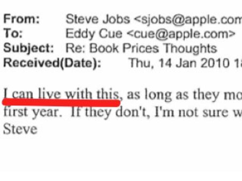 Ein angeblich nicht in Umlauf gebrachtes E-Mail von Steve Jobs an Eddy Cue, Apples Senior Vice President für Internet Software and Services, wurde im Prozess um E-Book Preisabsprachen als Beweismittel vorgelegt. Das vom US-Justizministerium vorgebrachte E-Mail scheint Apples Behauptung, dass es dem Unternehmen gleichgültig sei, welches Geschäftsmodell die Buchverlage mit Amazon aushandeln, zu widersprechen.