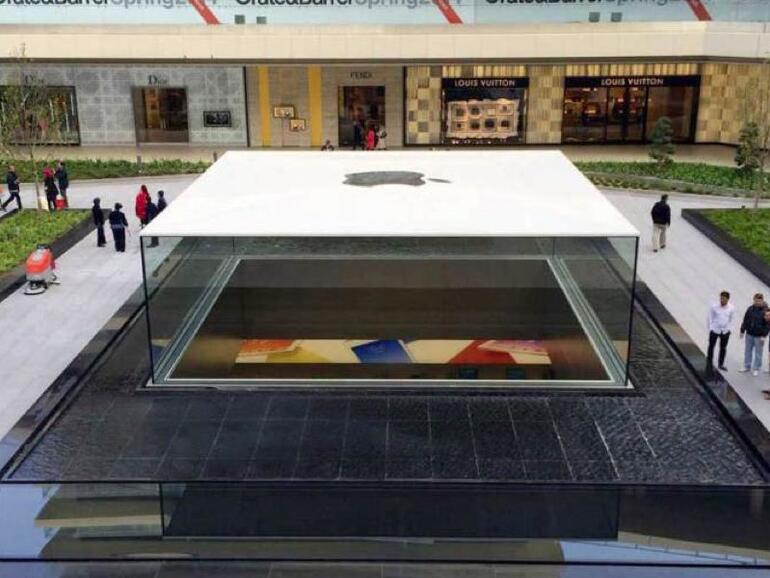 Der überwiegende Teil des zweigeschossigen Stores befindet sich unter der Erde. Nach oben geöffnet mit einem gläsernen, von einem Brunnen umgebenen Dachaufsatz aus vier großen Glasflächen mit weißem Dach, auf dem ein dunkleres Apple-Logo prangt.