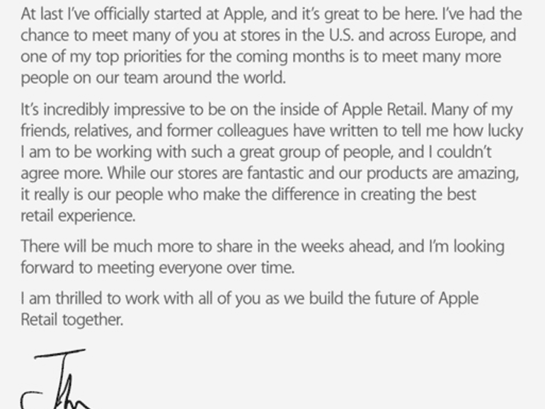 Mit der Floskel „it's great to be here“ beginnt er seine offizielle Arbeit bei Apple. Er fährt fort, dass er bereits viele Mitarbeiter in den Stores in den USA und Europa kennen lernen konnte. In den kommenden Monaten sei es sein Ziel, möglichst viele weitere Mitarbeiter in den Apple Stores weltweit zu treffen.