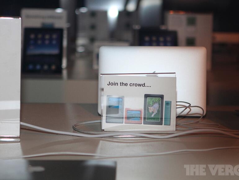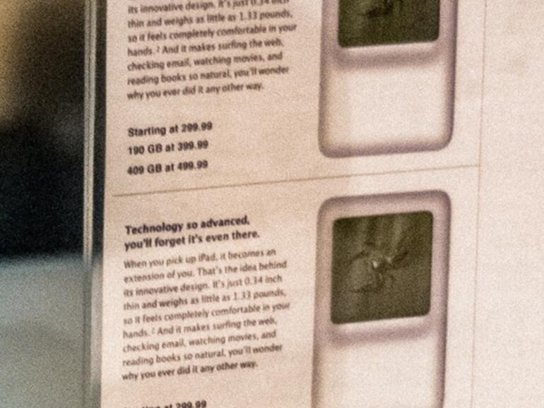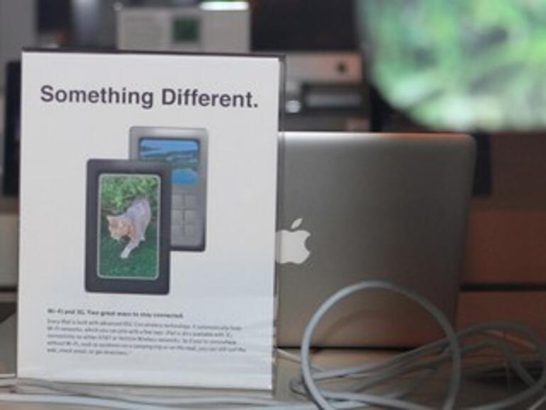 Zu sehen sind weiterhin Poster von ziemlich schlecht kopierten Apple-Geräten mit unrealistischen Details, aber auch eine bis ins Kleinste nachgebaute Beschilderung im Store. Sogar gefakte Produktinformationen zum iPad mit dem Hinweis auf WiFi- und 3G-Verwendbarkeit sind zu sehen.