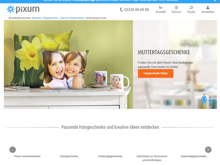 - Persönliche Fotogeschenke von Pixum - Schritt für Schritt (Bild: Pixum) - Schritt 1: GESCHENK AUSSUCHEN- Rufen Sie die Website www.pixum.de/muttertag auf. Dort finden Sie eine große Auswahl von Geschenkideen zum Muttertag. Angefangen vom Pixum-Fotobuch für die schönsten Familienbilder bis hin zum Fotokissen. Wählen Sie per Klick Ihr Wunschgeschenk aus, mit dem Sie Ihre Mutter überraschen möchten.