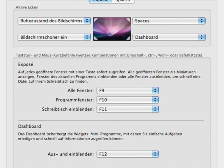 Standardmäßig lassen sich die Exposé-Funktionen über die Fasten F9, F10 und F11 aktivieren; in den Systemeinstellungen kann man die Tastenbelegung unter dem Kontrollfeld „Exposé und Spaces“ aber auch den eigenen Vorlieben nach ändern. Seit Leopard findet sich im Programme-Order (zu erreichen über die Seitenleiste des Finders) auch ein Programm-Verweis auf Exposé, welcher sich ins Dock ziehen lässt und fortan den Zugriff auf die Fensterübersicht per Mausklick erlaubt. Besonders praktisch: beim Aktivieren von Exposé kann auch eine „Ziehen & Ablegen“- Operation im Gange sein, wodurch sich Dokumente oder Textfragmente leicht und übersichtlich von einem Programm zum anderen ziehen lassen.