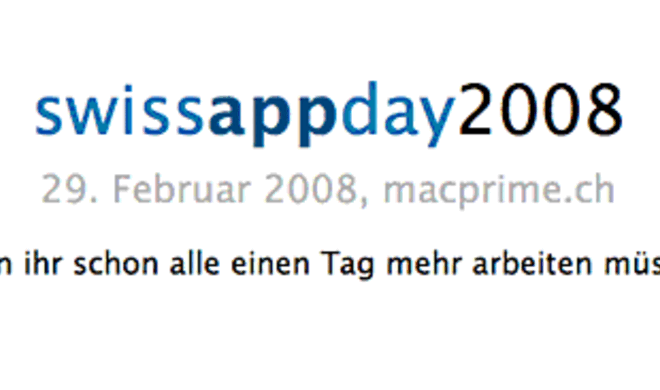 swiss app day 2008Zum Schalttag gibt's in der Schweiz Programme günstiger Erst zum Jahresbeginn starteten die Kollegen von macprime.ch die swiss app gallery, eine Liste von Applikationen für Mac OS X mit Bezug zur Schweiz. Inzwischen...