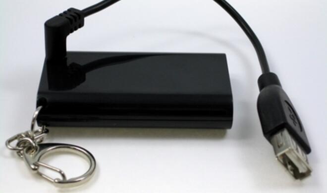 Zusätzliche LaufzeitAkku-Notfall-Set für iPod und Co. Das Akku-Notfall-Set von eyeTEK ist sehr klein, lässt sich am Schlüsselbund tragen und kann über USB am Computer aufgeladen werden.