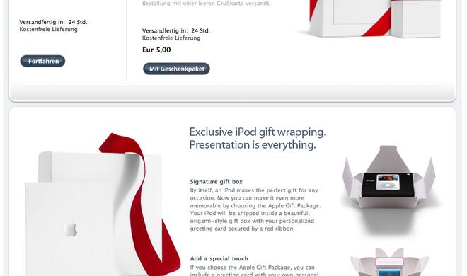 Merkwürdig ...Apple bietet neue Geschenkverpackung für iPods an Apple bietet eine neue Geschenkverpackung an, in die man gegen einen Aufpreis von 5 Euro seinen iPod im Apple Store verpacken lassen kann.