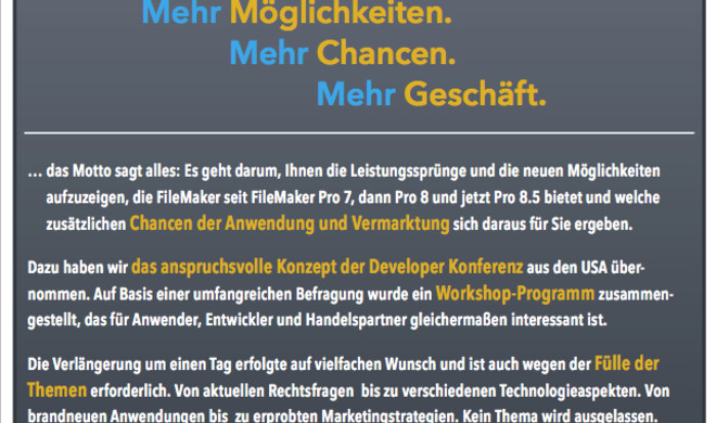 DatenbankprogrammFileMaker-Konferenz/Workshop am Chiemsee Unter dem Motto "Mehr Möglichkeiten. Mehr Chancen. Mehr Geschäft" lädt FileMaker in diesem Jahr vom 30. November bis 01. Dezember zur FileMaker-Konferenz an den...