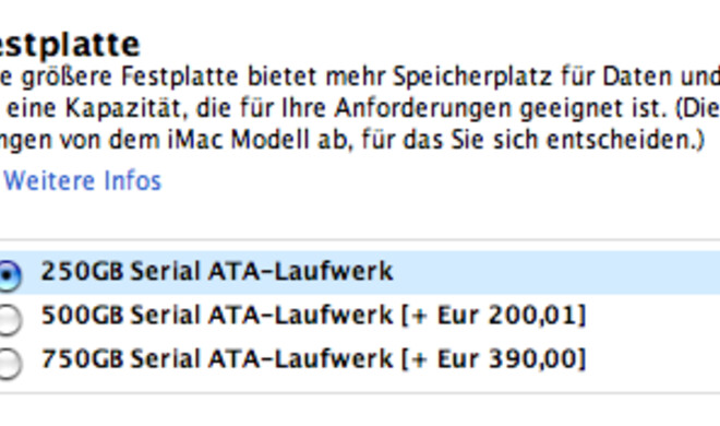 Apple erweitert KonfigurationsmöglichkeiteniMac 24" mit 750 GB Festplatte als BTO-Option Sowohl iMac 24" als auch Mac Pro sind jetzt im Apple Store wahlweise auch mit