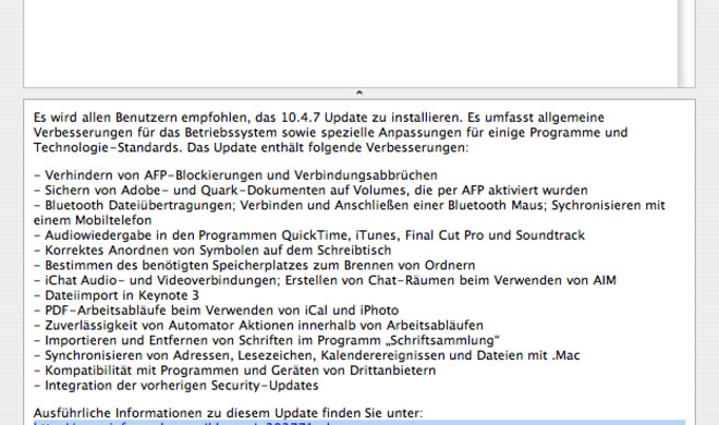 Betriebssystem-Update10.4.7 ist da Über die Software-Aktualisierung stellt Apple das Mac OS X Update 10.4.7 für PPC- und Intel-Macs zur Verfügung. Die Beschreibung lautet: "Es wird allen Benutzern...