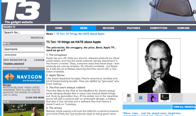 T3: Je 10 Argumente für und gegen AppleApple-Fans sind "Langweiler, die glauben, hipp zu sein" Die britische IT-Webseite T3 ist eigentlich Apple-freundlich: Ende 2007 vergab sie sechs Auszeichnungen "für einige der besten Technologieprodukte der Menschheit...