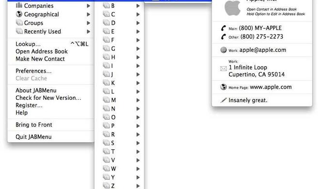 Menü-AdressbuchJABMenu 2.1.2 Das Adressbuch in Mac OS X ist mehr als eine Anwendung, es ist ein systemweiter Dienst, der eben nicht nur von dem gleichnamigen Programm, sondern beispielsweise...