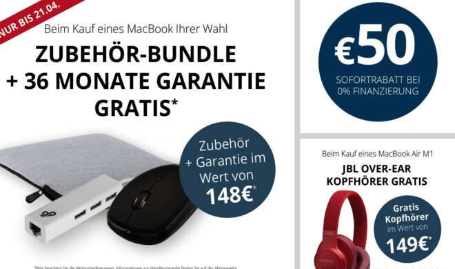 Zubehör-Paket oder JBL-Kopfhörer kostenlos dazuMacBook kaufen: So sicherst du dir Zubehör und 36 Monate Garantie im Wert von 200 Euro gratis Der Apple-Händler MacTrade bietet aktuell eine Bundle-Aktion, bei der du fast 200 Euro sparen kannst, wenn du dir in neues MacBook kaufst. Wir zeigen dir was...