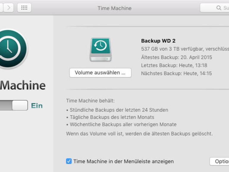 Man kann es nicht oft genug sagen, aber ein regelmäßiges Backup ist einfach Pflicht, wenn einem etwas an den Daten auf dem Mac liegt. Die Einrichtung von Time Machine benötigt einmalig etwas Zeit, danach läuft alles automatisch. Genau das ist auch wichtig, denn bei manueller Sicherung besteht immer die Gefahr, dass man sie gerade am falschen Tag verschoben oder vergessen hat. Du musst eigentlich nur noch aufpassen, dass das Backup-Volume nicht voll ist. Schalte dir die entsprechende Warnung in den Backup-Optionen nicht ab.