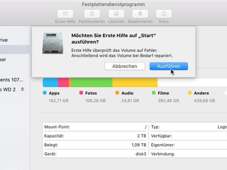 Kleine Fehler in der Festplattenverwaltung lassen sich meist problemlos beheben. Mache zumindest auf dem Startvolume einmal im Monat einen Testlauf mit der Erste-Hilfe-Funktion des Festplattendienstprogramms. Schiebe Test und Reparatur nicht auf die lange Bank, sonst entstehen leicht Folgefehler.