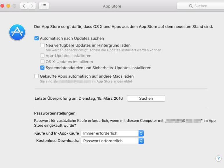 Regelmäßige Updates sind wichtig. Am besten aktivierst du in der Systemeinstellung „App Store“ die automatische Suche oder prüfst wöchentlich, ob sicherheitsrelevante Updates verfügbar sind. Download und Installation zu automatisieren empfiehlt sich nur für Anwender, die sich gar nicht selbst kümmern wollen. Eine Ausnahme ist die Option für Systemdateien und Sicherheitsupdates, bei denen man mit der Installation nicht unnötig warten sollte.