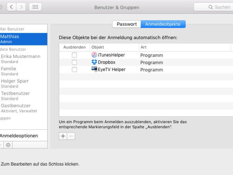 Es kommt der Systemperformance zugute, wenn nicht mehr Apps auf dem Rechner aktiv sind als nötig. Eigentlich eine ganz simple Erkenntnis, aber einige Apps übersieht man leicht. Bei der monatlichen Wartung solltest du auch einen Blick in die Systemeinstellungen „Benutzer & Gruppen“ werfen. Hier findest du unter „Anmeldeobjekte“ Hintergrundprozesse von Apps, die automatisch gestartet werden. Entferne alle, die du nicht benötigst.