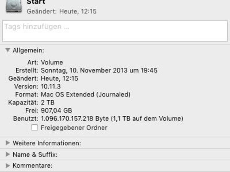 Pass auf, dass die Festplatte nicht zu voll wird. Das gilt besonders für das Startvolume, da hier nicht nur Platz für deine tägliche Arbeit benötigt wird, sondern auch für die virtuelle Speicherverwaltung von OS X. Findet die keine größeren zusammenhängenden freien Bereiche mehr auf dem Startvolume, drückt das auf die Performance. 5, besser 10 Gigabyte sollten daher immer frei bleiben. Den freien Platz siehst du unter anderem im Info-Fenster des Volumes oder in der Statusleiste am unteren Fensterrand.