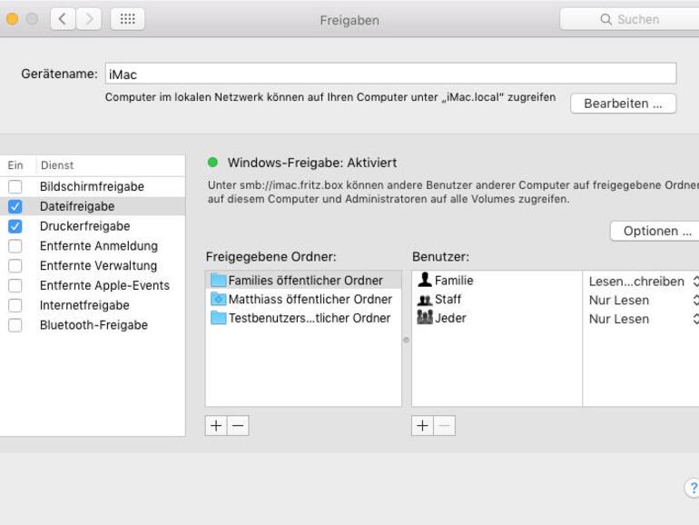 Das Gleiche gilt auch für den Systemeinstellungsbereich „Freigaben“. Hier schaltest du alle nicht ständig benötigten Serverfunktionen aus. Wenn man Dienste nur gelegentlich braucht, solltest du sie erst bei Bedarf einschalten und hinterher auch wieder deaktivieren. Das kommt ganz nebenbei auch der Sicherheit zugute.