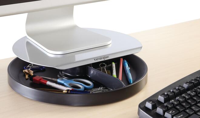 Kensingtons Smartfit-Spin-2-Monitorständer beseitigt gleich zwei Probleme auf einmal: Zum einen können Sie ihn auf eine Höhe einstellen, die für Sie angenehm ist, um bei auch längeren Arbeitsstunden am Rechner Rücken- oder Nackenschmerzen zu vermeiden. Zudem ermöglicht er Ihnen, Ordnung auf Ihrem Schreibtisch zu schaffen. Die unter der Plattform befindliche dreigeteilte Ablage bietet zahlreichen kleineren Utensilien Platz und ist drehbar, damit Sie immer schnell das richtige Zubehör griffbereit haben.