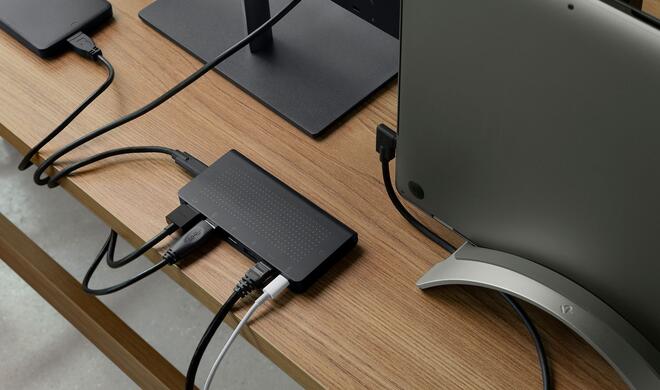 Bei den neueren MacBook Pro-Modellen steht man etwas dumm da, will man Inhalte per USB-A-Stick übertragen oder andere Medienformate andocken. Glücklicherweise gibt es genug Hubs auf dem Markt – einer der nützlichsten ist das Staygo von Twelve South. Neben dem mitgelieferten, einen Meter langen Kabel ist es mit einem weiteren ausziehbare Kabeln ausgestattet und glänzt mit einem HDMI-, drei USB-A-, einem Ethernet- und zwei USB-C-Anschlüssen. Darüber hinaus gibt es einen SD- und einen Micro-SD-Kartenslot.