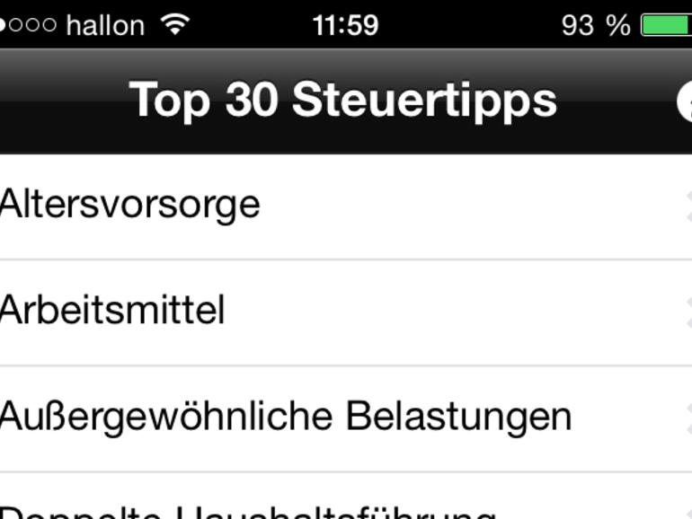Diese App verspricht nicht weniger, als Ihnen die 30 besten Steuertipps zu geben, mit deren Hilfe Sie sich Ihr Geld vom Finanzamt zurückholen Die Tipps stammen dabei aus dem Standardwerk „1000 ganz legale aus dem gleichem Hause und decken Themenbereiche wie Altersvorsorge, außergewöhnliche Belastungen, doppelte Haushaltsführung, Entfernungspauschale, Firmenwagen, Kinderfreibetrag und Werbungskosten ab. Konz Tipps ist gratis. Sollte für Sie nichts Neues dabei sein, verschwenden Sie immerhin keinen Cent.