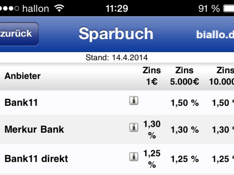 Die kostenlose App Geldanlage verspricht, die besten Zinsen für die Anlage Ihres Ersparten zu finden. Sie durchsucht die verschiedenen Angebote von lokalen und auch überregional aktiven Banken. Dabei vergleicht sie Tagesgeld mit kurzen Laufzeiten, Festgeldkonten mit Anlagezeiträumen von drei bis zwölf Monaten, Sparbriefe und normale Sparkonten. Die App ist ebenso gratis wie zwei weitere die Konditionen für Ratenkredite, Autofinanzierungen und Baufinanzierungen vergleichen können.
