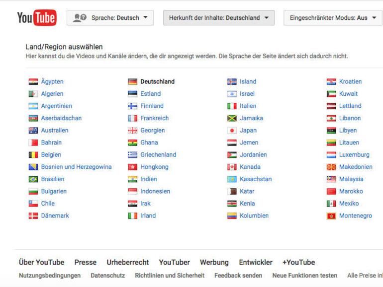 Scrollen Sie ganz nach unten, um die Sprache Ihrer Startseite zu ändern. Sie können zum Beispiel von Deutsch zu Italienisch wechseln. In der unteren Leiste können Sie zudem die Herkunft der Ihnen angezeigten Inhalte ändern. Wählen Sie aus der Liste das Land oder die Region, aus dem Sie Videos und Kanäle angezeigt haben möchten. Klicken Sie auf „Eingeschränkter Modus“, um einen Filter zu aktiveren. Ihnen werden dann keine Videos mehr angezeigt, deren Inhalt von andere Nutzern als Verstoß gegen die Allgemeinen Geschäftsbedingungen oder als unangemessen gemeldet wurde. In der neuen Version finden Sie diese Einstellungen mit einem Klick auf Ihr Profil.