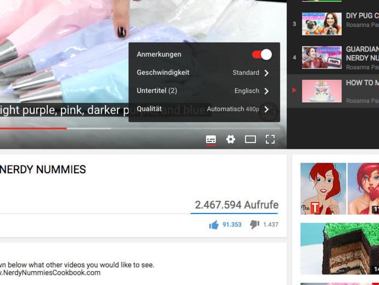 Hinweis: Nach und nach rollt Youtube eine neue Desktop-Oberfläche für seine Nutzer aus. Je nachdem ob Sie schon die neue Version oder noch die klassische Oberfläche haben, können sich leider einige Angaben und Symbole unterscheiden. Unter https://www.youtube.com/new können Sie die neue Oberfläche testen. Besonders gefällt uns das neue dunkle Design, das Sie jetzt aktivieren können. Dafür gehen Sie auf Ihr Profil und klicken auf „Dunkles Design: Aus“. In dem Menü unter Ihrem Profil können Sie im neuen Design nun alle Einstellungen, die sich vormals in der unteren Menüleiste befunden haben, einstellen.