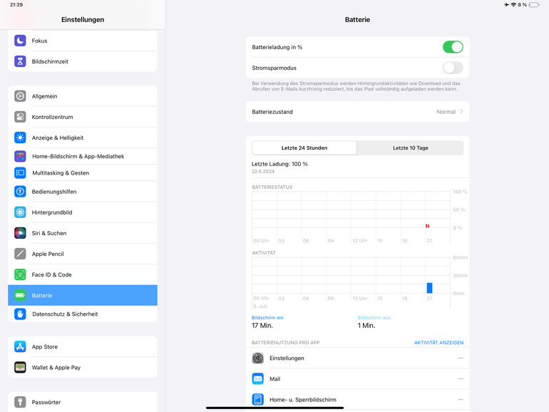 Das 2024er iPad Air und iPad Pro verfügen als erste Apple-Tablets über ein erweitertes Batterie-Menü. Darin kannst du jetzt nicht mehr nur den Batteriezustand ablesen oder die Batterienutzung deiner Apps nachverfolgen, sondern darin findest du auch einige praktische Einstellungen und Informationen. Öffne dazu die Einstellungen-App und rufe den Eintrag „Batterie“ auf. Tippe anschließend auf „Batteriezustand“. Neben dem Zustand und der maximalen Kapazität kannst du seit neuestem auch die Anzahl der Ladezyklen einsehen. Mit steigender Zahl wird auf Dauer die Kapazität abnehmen.