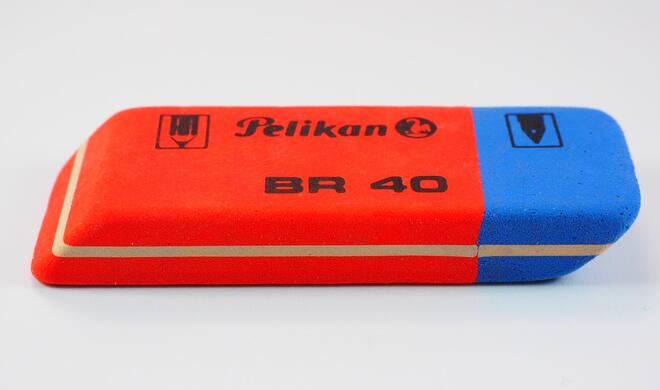 Radiergummi: Rote Seite für Bleistift, blau für Tinte