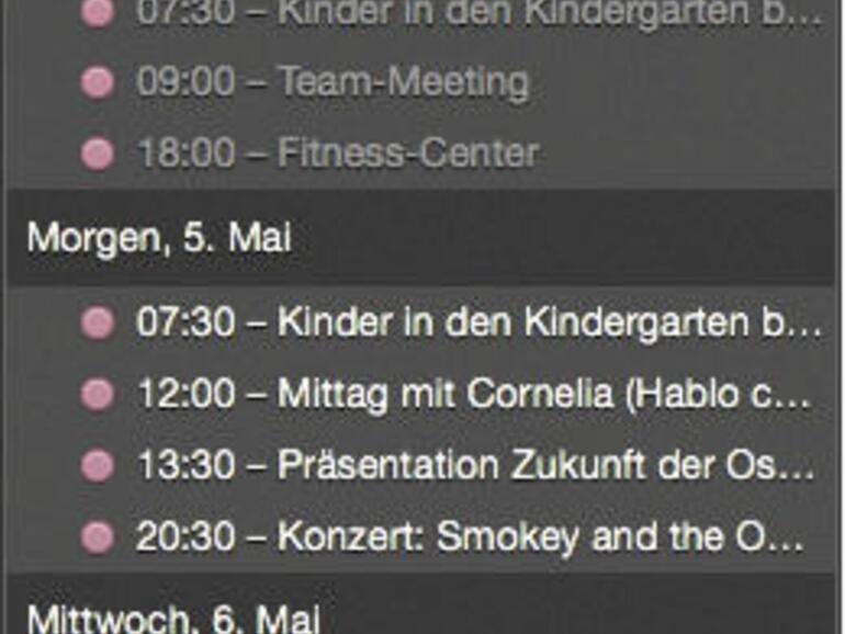 Ein bedeutender Vorteil gegenüber Apples Kalender-Anwendung ist das Menulet. Per Klick auf das Programmsymbol können Sie Kalender durchsuchen und neue Termine anlegen. Das Fenster lässt sich auch von der Menüleiste abtrennen und in seiner Größe ändern. Selbst die Schriftgröße und der angezeigte Zeitraum sind konfigurierbar. Anstehende Aufgaben bleiben so im Fokus.
