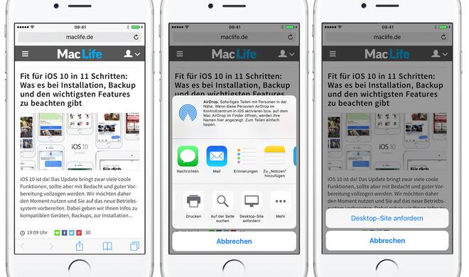 Dazu öffnest du den Safari-Webbrowser. Rufe dann mal eine Webseite — die wie maclife.de für Smartphones und Tablets optimiert ist — auf. Danach tippst du auf „AA“ in der Adressleiste. Es erscheint die Option „Desktop-Website anfordern“. Mit einem Fingertipp darauf wird die Seite als Desktop-Seite neu geladen - einfach oder?