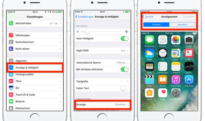 Gleich oben unter der Überschrift „Anzeigezoom“ findest du die Einstellung „Vergrößert“. Wähle diese an, um darunter eine Vorschau zu erhalten. Du kannst auch durch drei Seiten wischen, um somit einen Eindruck von dem Feature in verschiedenen Standardapps zu erhalten. Wenn du die Anzeige umstellen möchtest, dann wählst du die gewünschte Option aus und stellst sicher, dass diese blau hinterlegt ist, danach kannst du auf „Einstellen" tippen. Bestätige die Eingabe. Beachte jedoch, dass die Einstellungen nicht auf den kleinen iPhone-Modellen wie dem iPhone X oder iPhone 8 zur Verfügung steht.