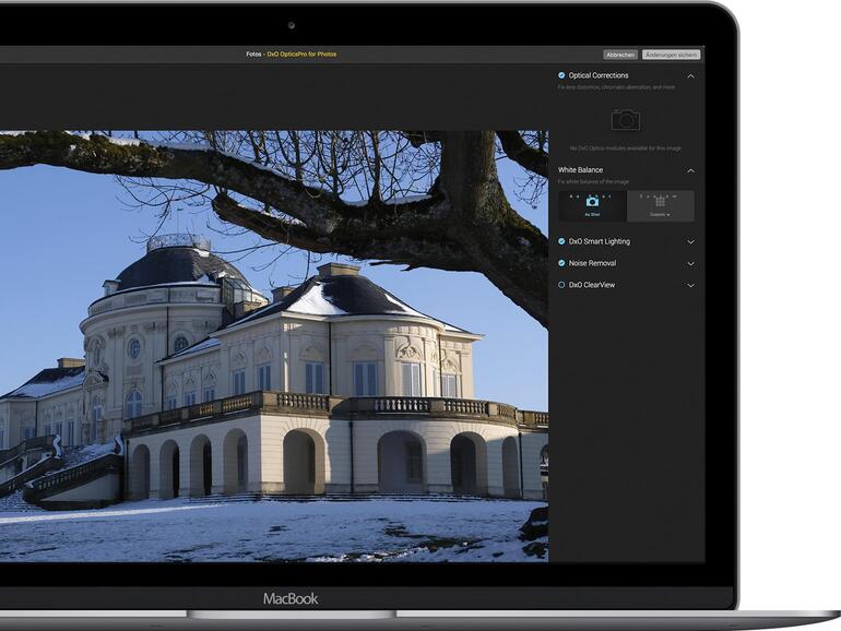 Mit DxO Optics Pro lassen sich bei unterstützten Kameramodellen und Objektiven in erster Linie Objektivfehler, etwa Verzeichnungen und Farbsäume, korrigieren. Das Foto muss dazu allerdings im RAW-Format vorliegen. Zudem können Sie das Bildrauschen etwas verbessern, die Belichtung anpassen sowie den Weißabgleich ändern.