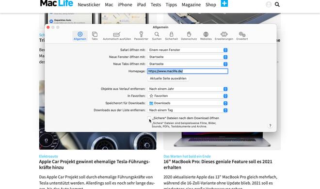 Auch in Big Sur hat Apple die Voreinstellung für neue Benutzer beibehalten, dass Safari vermeintlich sichere Downloads automatisch öffnet, obwohl man nicht wirklich von der Dateiart auf die Ungefährlichkeit schließen kann.