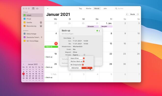 Die macOS-App Kalender erlaubt die Verknüpfung von Dokumenten oder Apps mit einem Termin, um sie so zu öffnen. So kannst du zum Beispiel mithilfe eines Termins ein Dokument öffnen oder regelmäßig ein Automator-Programm starten, das wichtige Daten archiviert.