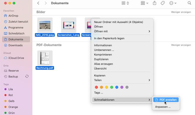 Dazu gehören die meisten Fotos, Screenshots und natürlich PDF-Dateien – auch mehrseitige. Markiere alle gewünschten Dokumente im Finder. Dann öffnest du per [ctrl]- Klick (oder rechter Maustaste) das Kontextmenü und wählst darin „Schnellaktionen > PDF erstellen“. Der Finder fügt die Dokumente in der Reihenfolge zusammen, in der du sie markiert hast.