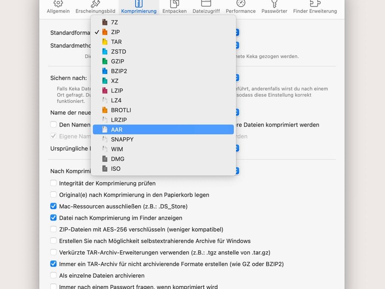 Da wäre zunächst einmal die Formatauswahl: Keka offeriert dir nicht weniger als 16 Packformate; darunter die üblichen Verdächtigen wie ZIP (in verschiedenen „Geschmacksrichtungen“ wie GZIP und 7-Zip) und DMG, aber auch Exoten wie das von Google entwickelte Snappy und das Apple-Archive-Format (AAR). Für die meisten lässt sich zudem die Packmethode auswählen. Als Faustregel gilt: Je langsamer der genutzte Algorithmus, umso länger dauert das „Verschnüren“ – im Zeitalter schneller Apple-Prozessoren ist dieser Wert aber ohnehin subjektiv.