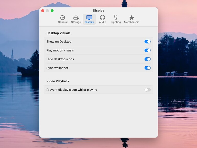 Der Einstellungsdialog trägt sich in der Menüleiste des Mac ein. Von hier aus kannst du die einzelnen Elemente jederzeit schnell ein- und ausschalten. Die kostenfreie Version bietet immerhin drei audiovisuelle Sammlungen an.