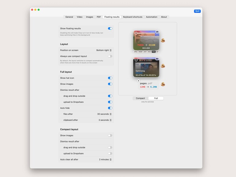 Möchtest du die zu optimierenden Dateien lieber händisch per Drag-and-Drop übergeben, bietet dir Clop dafür ein schwebendes Fenster an. Dessen Position und Aussehen sowie das Verhalten kannst du bis ins Detail selbst festlegen.