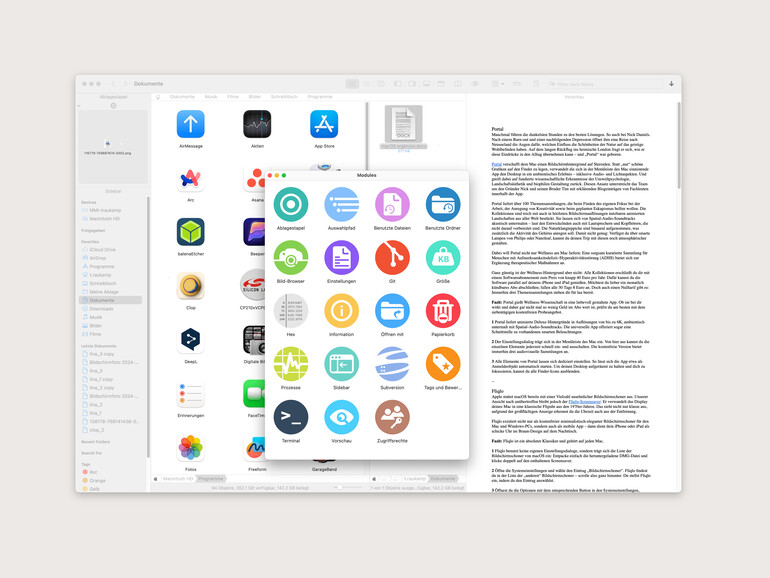 Alle Elemente von Portal lassen sich dediziert einstellen. So lässt sich die App etwa als Anmeldeobjekt automatisch starten. Um deinen Desktop aufgeräumt zu halten und dich zu fokussieren, kannst du alle Finder-Icons ausblenden.
