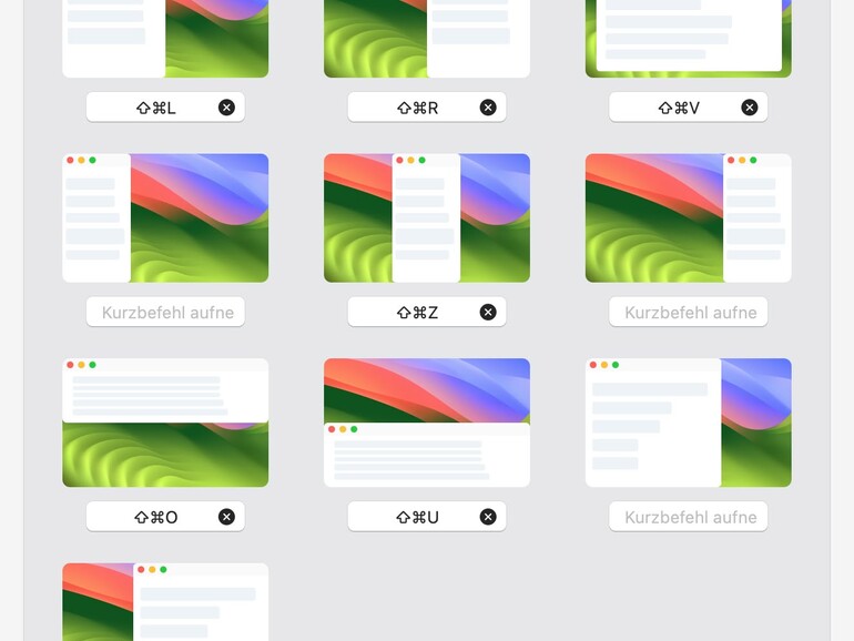 Noch schneller als mit der Maus kannst du mithilfe von Tastaturkürzeln die Position von Fenstern bestimmen. Klicke dafür das Feld unter einem Layout an, um daraufhin die von dir favorisierte Tastenkombination einzugeben.