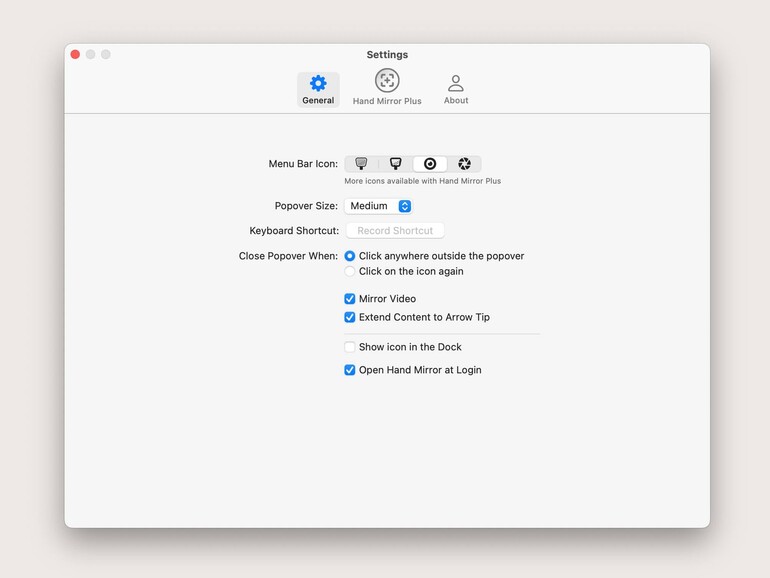 Einen Blick sind die Voreinstellungen von Hand Mirror wert. Hier kannst du etwa zwischen drei verschiedenen Größen für das Vorschaufenster und zwischen vier Icons für die Darstellung in der Menüleiste wählen.